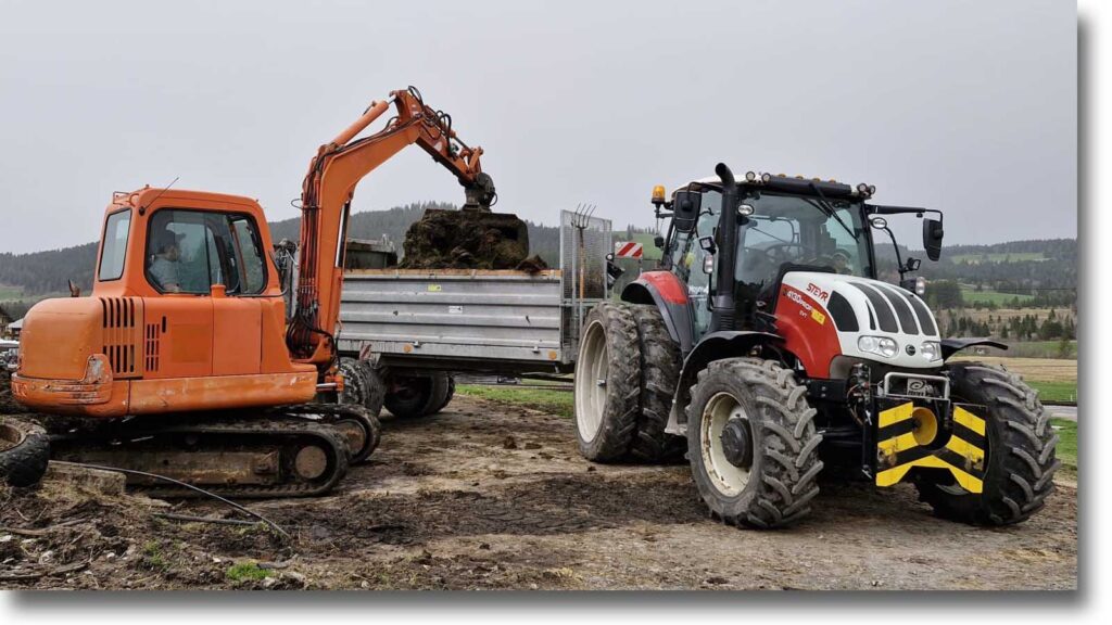 Mist aufladen mit Bagger oder mit Traktor, Frontlader und Kroki-Zange.